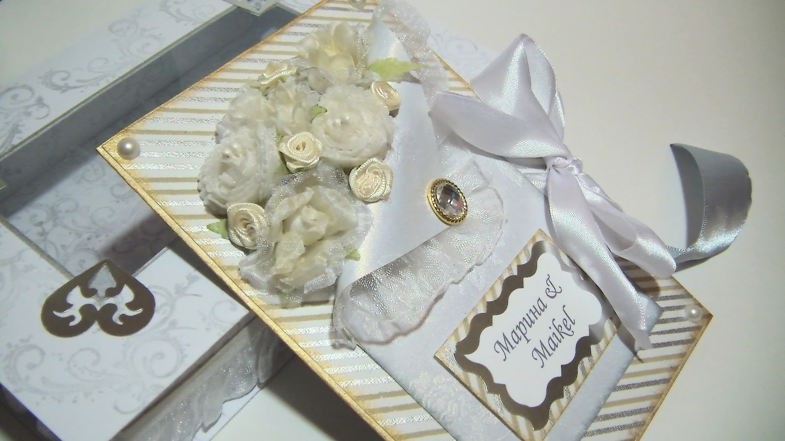 Попросили сделать свадебную открыточку, чтобы в ней было предусмотрено место для денежки, для текста поздравления и место для текста притчи о семейной жизни и песни)))) Ничего такого я еще не делала, прогулялась -повдохновлялась по свадебным открыткам разных мастериц, и в конце концов получилась у меня повторюшка с отворотом со свадебным оттенком))) Фотки правда бликуют-отсвечивают,хотя фотала без вспышки. Края на самом деле тонированы золотым акрилом, на фотке как то ржаво выглядят. Надпись на объемном скотче